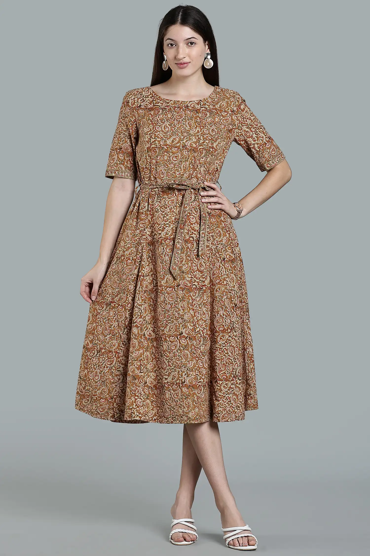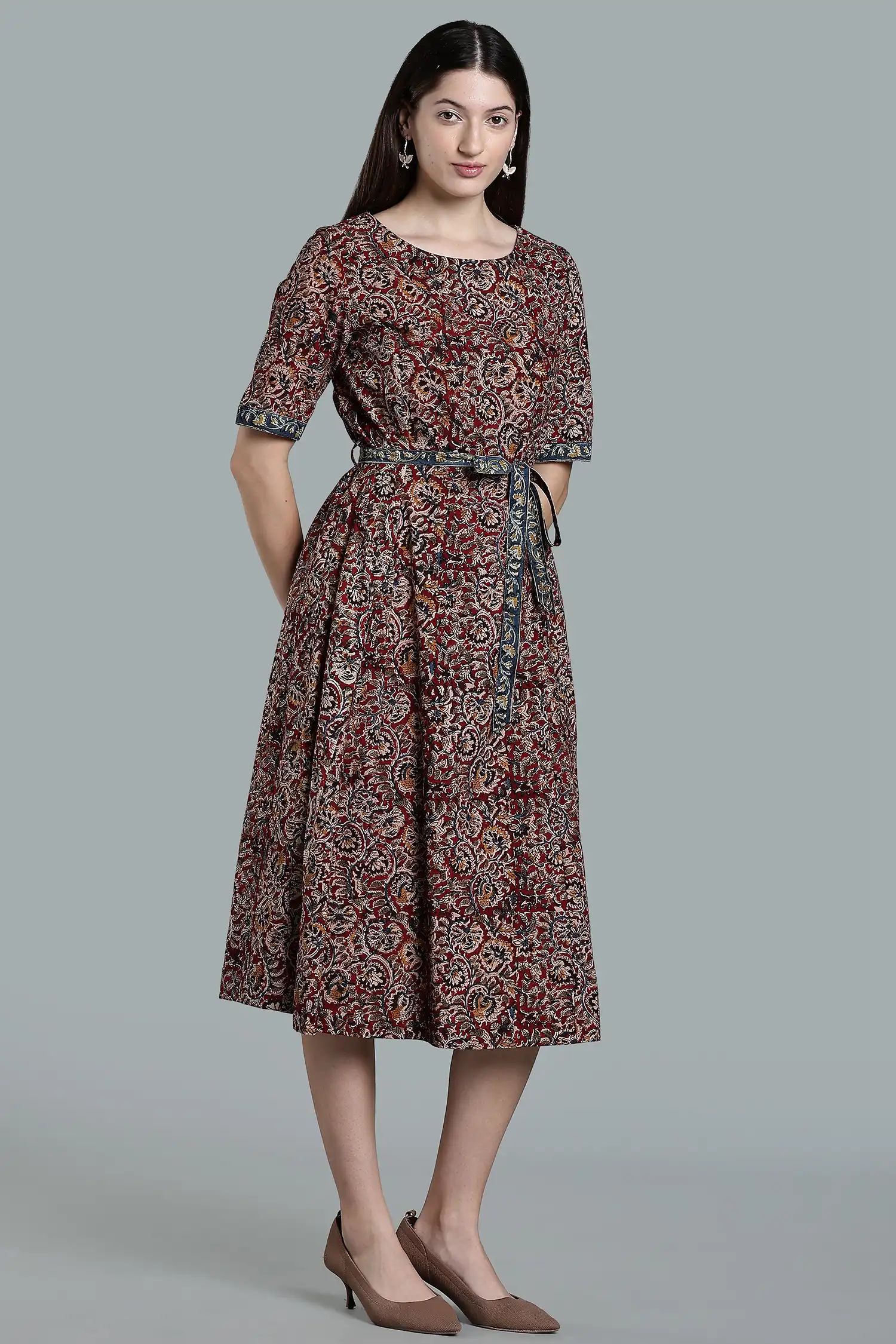 KALAMKARI COTTON DRESS ELBOW SLEEVE BELT DETAIL – RED MG