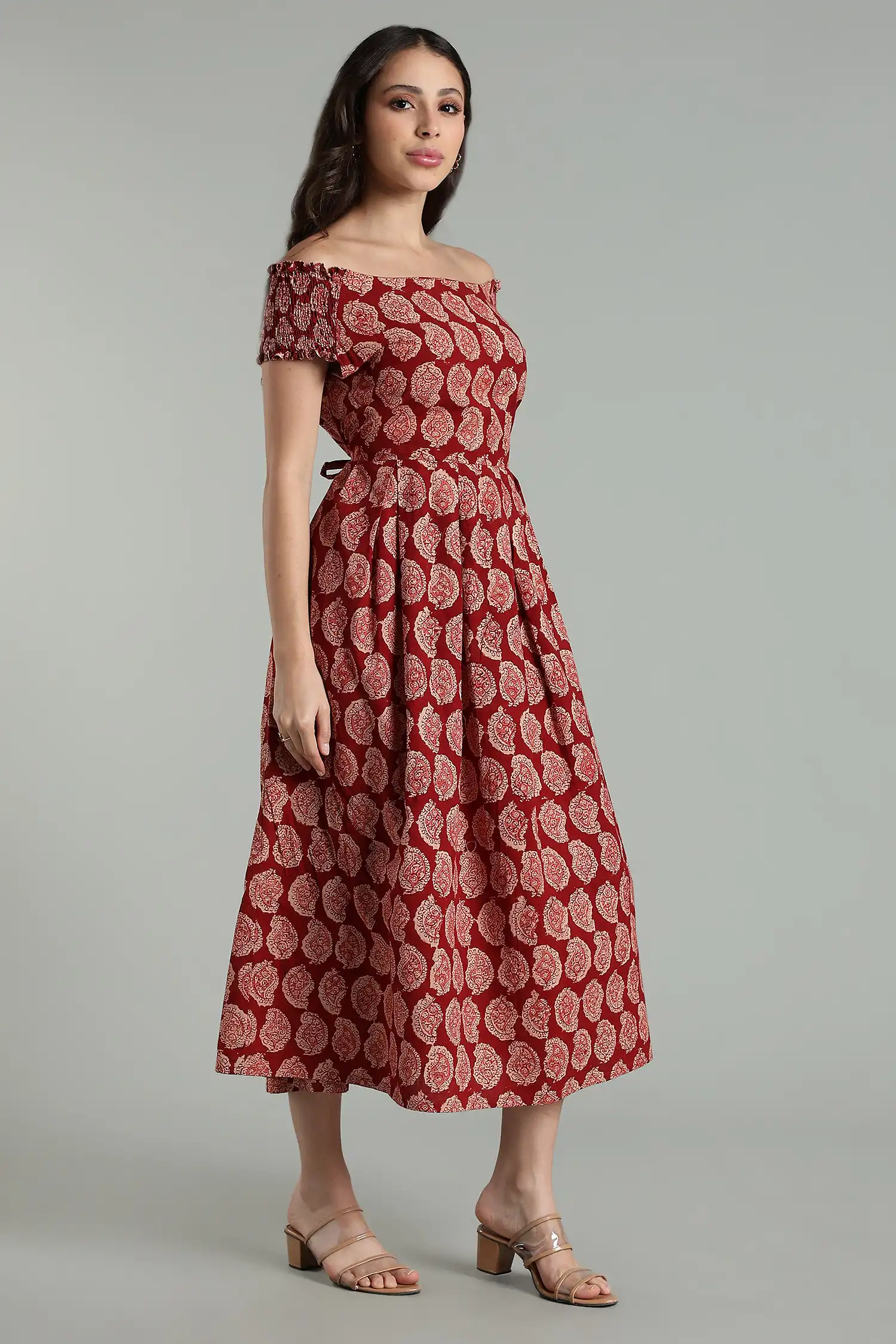 KALAMKARI COTTON DRESS OFF SHOULDER – YELLOW