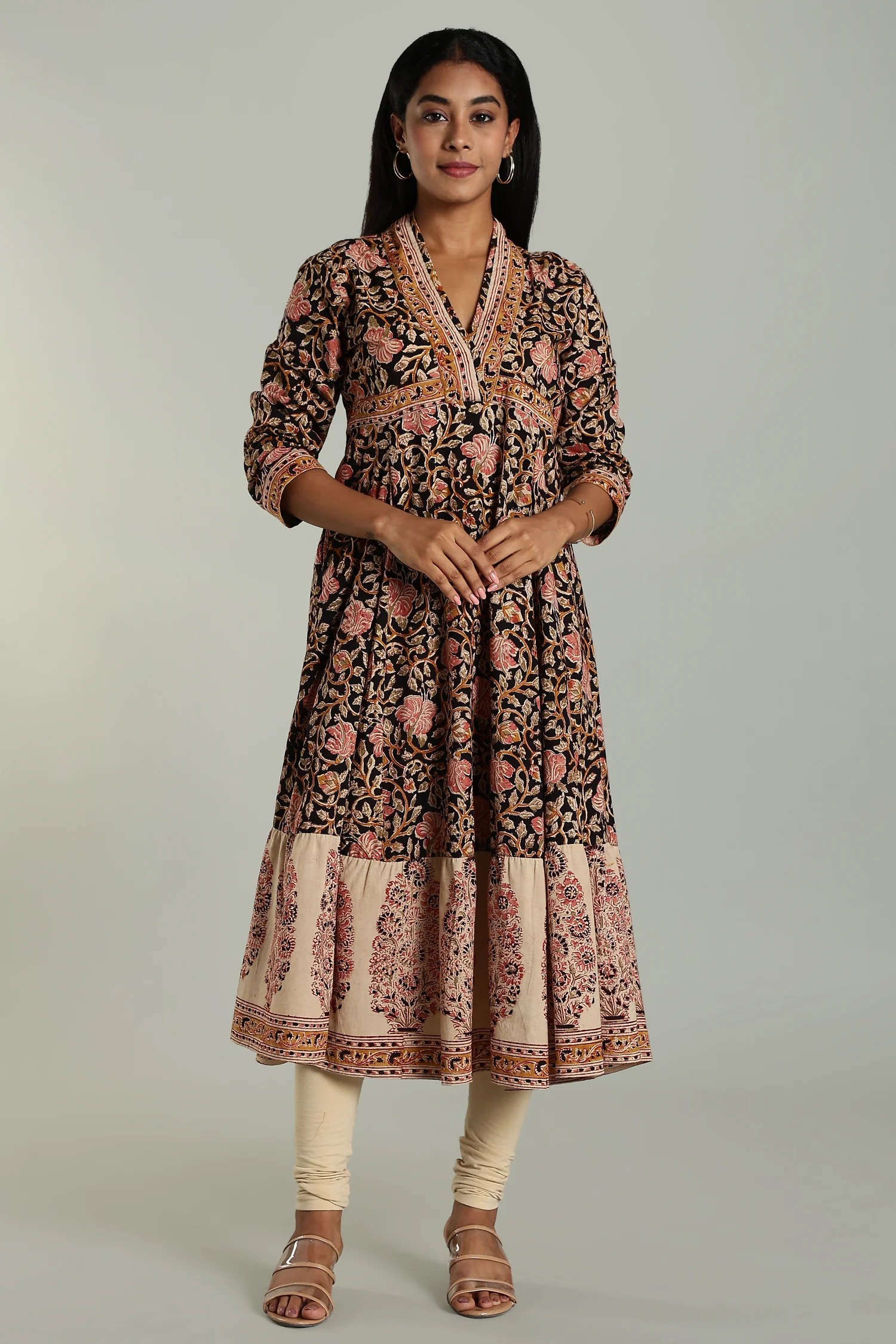 KALAMKARI KURTA FUNNEL NECK BORDER RED