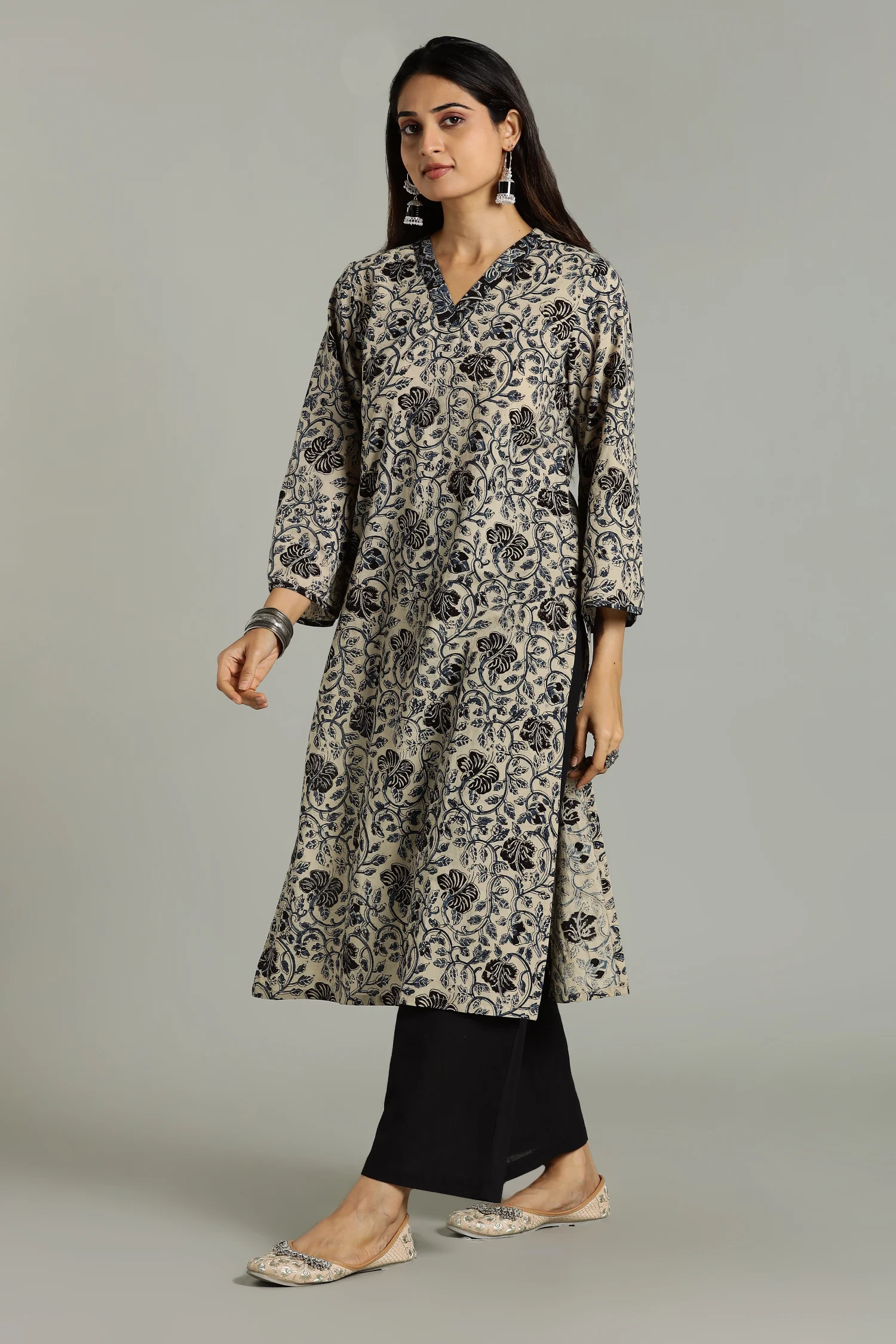 KALAMKARI KURTA V NECK BELL SLV BLACK